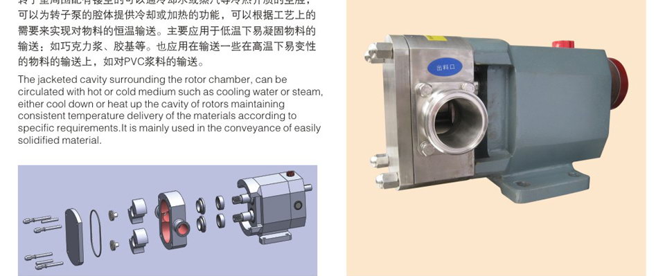 6、轉子和轉子之間絕無接觸,長期使用亦無磨損,運轉平穩,噪音低,效益高。 7、設計新穎、安裝維護簡單容易,方便清洗,保證機器內部和生產衛生清潔。